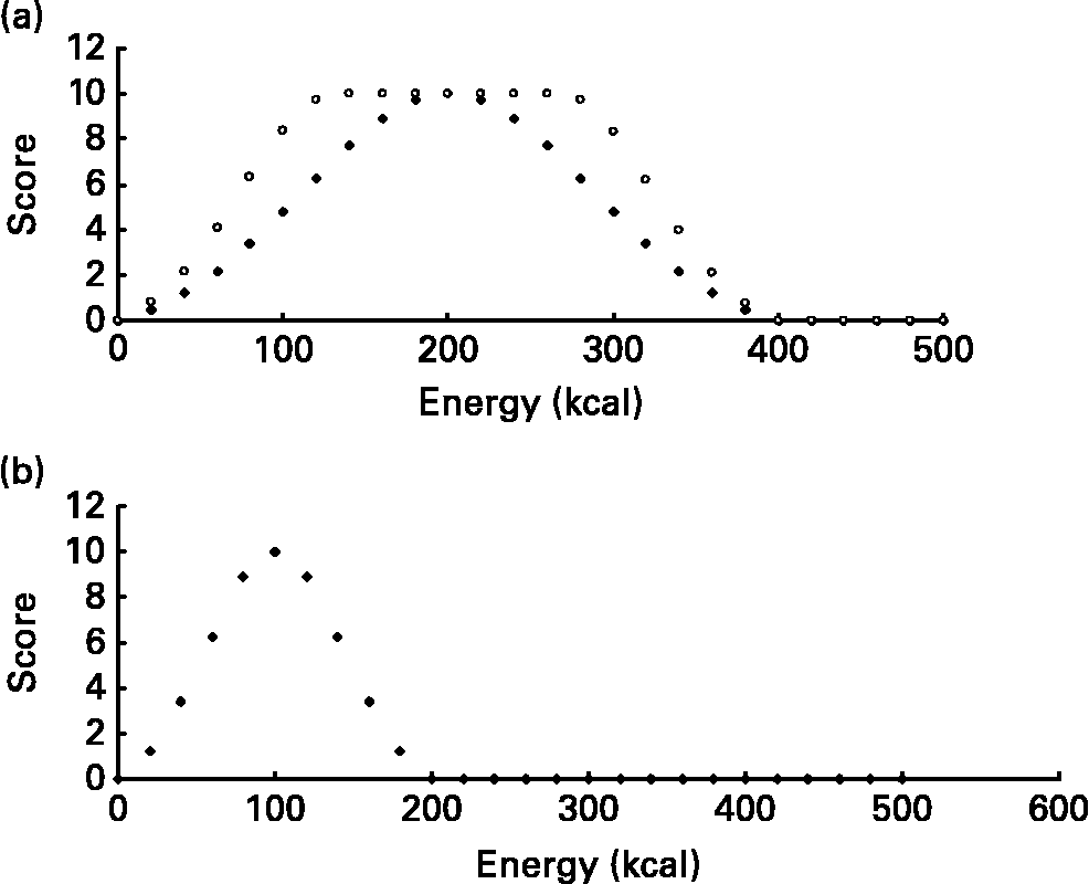 Noticeably, the system favours portion sizes that by default do not constraint the main meals and is in line with the wider aim of favouring food items with low- to moderate-energy loads. Such recommendations regarding food size are in agreement with those of the DG-SANCO (see above) and with data from the literature that indicate energy loads as the main determinants of obesity(Reference Taylor, Missik, Hurley, Hudak and Logue29). The calculations are based on a Gaussian distribution of the energy provided as shown in Fig. 1 (b).
