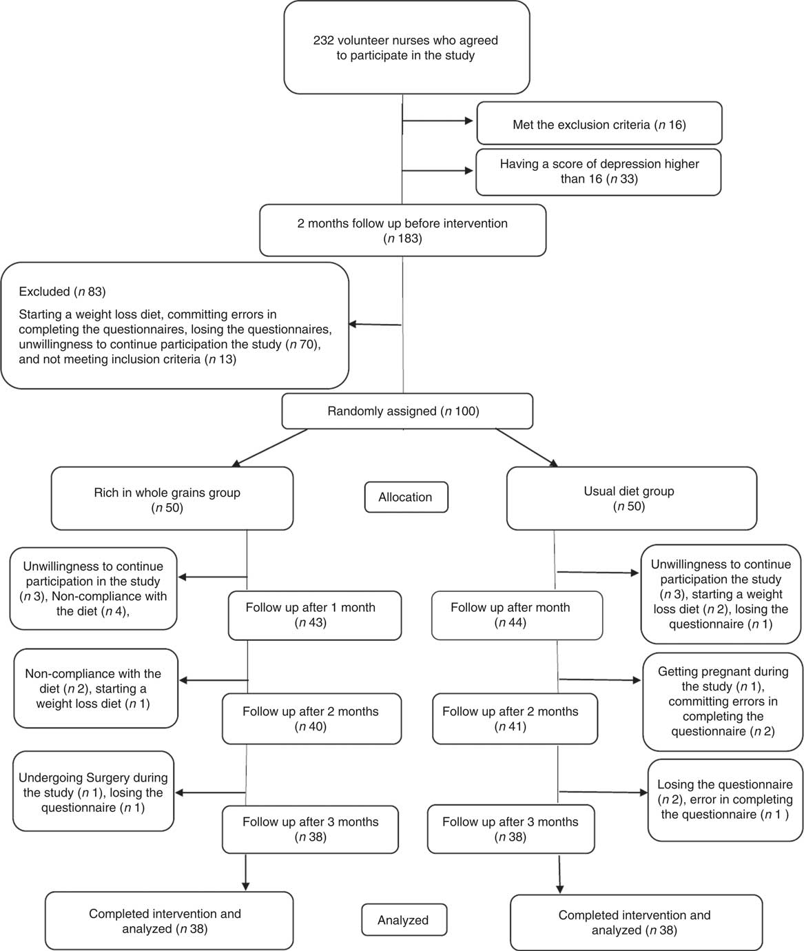 The greatest advantage of this study is the strong effect of whole grain consumption on reducing the PMS scores. Of other advantages, one can refer to the 5-month follow-up of the participants in dietary patterns and lifestyle 2 months before and 3 months after the start of intervention. One limitation of the study was it being open-label and the possibility of placebo effect due to its nature and impossibility of blinding; although in the study conducted by Freeman & Rickels( Reference Freeman and Rickels 40 ), to evaluate the effect of placebo on the treatment of PMS, the majority of participants reported only partial improvement or no improvement at all. The second limitation was its high dropout rate of participants during the study due to high workload and subsequent loss of their data and not using intention-to-treat analysis. To overcome this problem, two models of adjusting covariates, especially baseline values in statistical analysis were used. In addition, dropout of non-compliant patients could help to get definite results. Not including the nurses from hospitals’ operating rooms in the study due to the difficulty in entering those sections was among other limitations of the study. Although we lost data on nurses with high stress jobs, we eliminated the effect of stress on PMS.