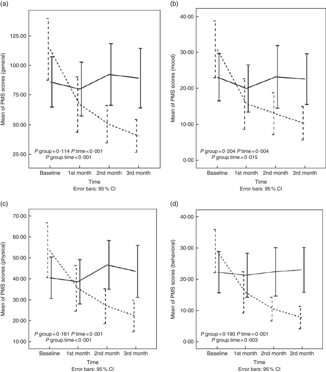 Fig. 2 Changes in general (a), mood (b), physical (c) and behavioural (d) scores of premenstrual syndrome (PMS) in nurses with PMS who received diet enriched with whole grains or usual diet for 3 months. Values are means, with 95 % confidence intervals represented by vertical bars. P values represent the effect of time, group and time×group interaction computed by analysis of general linear model ANOVA for repeated measurements after adjusting for baseline value of the outcome, marital status; age; duration of a menstrual cycle; the mean change of physical activity; intake of energy, protein, carbohydrate, and fat across different times during the study; and changes in BMI, body fat mass, skeletal muscle mass, percentage of body fat and waist:hip ratio.