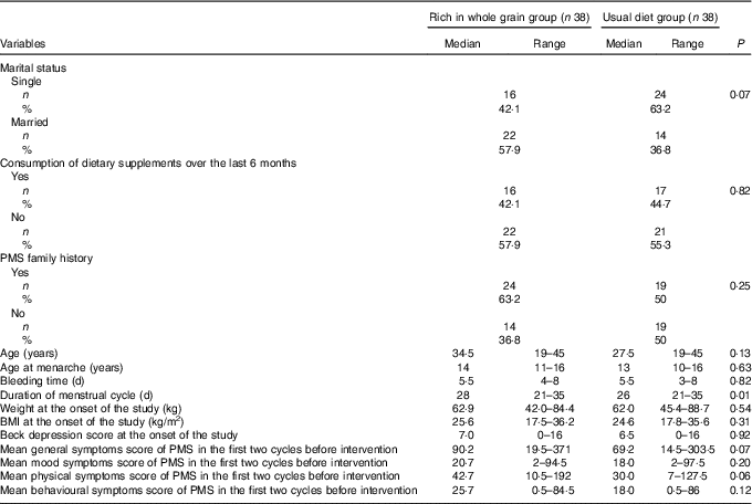One hundred participants were randomly allocated to the intervention and control groups. Next, six individuals, due to loss of interest in participation in the study; six individuals, due to not following the intervention (consuming less than four servings of whole grains in the intervention group); one individual, due to going under surgery; three individuals, due to following weight loss diets; one individual, due to becoming pregnant during the course of study; four individuals, due to losing DSR or food record questionnaire; and three individuals, due to committing errors in completing the questionnaires were excluded from the study. Ultimately, seventy-six individuals including thirty-eight in the intervention group and thirty-eight in the control group completed the study (Fig. 1). Results of the χ 2 test showed that there were no significant differences between the two groups in baseline characteristics and demographics other than the duration of a menstrual cycle that was longer in the intervention group than that in the control group (P=0·007) (Table 1).