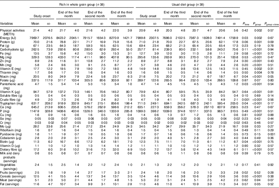 Covariance analysis test (by adjusting the base values) showed significant differences (P<0·05) in consumption of energy, protein, carbohydrate, Fe, Mg, Zn, Mn, vitamin E, thiamine, pantothenic acid, vitamin K, crude fibre, tryptophan, P, Cu, pyridoxine, biotin, dietary fibre, cereals and fats and that the intake of these nutrients and food groups after adjustment of the base values was higher in the intervention group than that in the control group. The mean of whole grain consumption changed in the control group from 0·59 servings before the start of intervention to 0·71, 0·61 and 0·59 servings in the first, second and third months after the start of intervention, respectively, and it changed in the intervention group from 0·94 servings before the intervention to 5·36, 4·29 and 5·35 servings in the first, second and third months after the start of intervention, respectively.