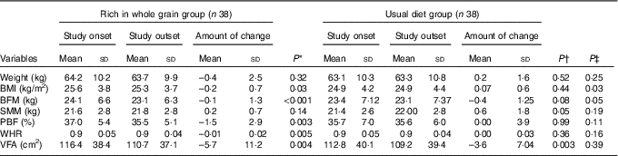‡ Comparison between change values in the two groups of whole grain and usual diet groups by adjusting the base values applying co-variance analysis.