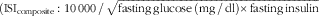 $$({\rm ISI}_{{{\rm composite}}} \,\colon\,{\rm 1}0\,000\,/\,\sqrt {{\rm fasting}\,{\rm glucose}\,\left( {{\rm mg}\,/\,{\rm dl}} \right){\times}{\rm fasting}\,{\rm insulin}$$