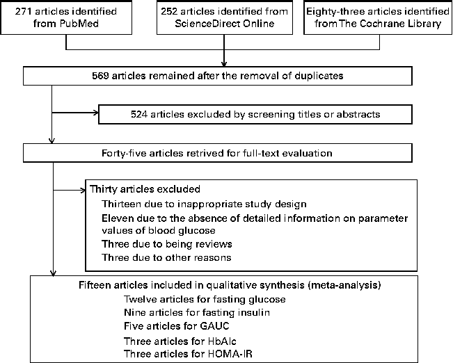 Oats, which are considered to be unique among the cereals, belong to the Poaceae family and are known as ‘Jai’ or ‘Javi’ in the Indian subcontinent( Reference Sadiq Butt, Tahir-Nadeem and Khan 8 ). In the mid-1980s, oats were recognised as a healthy food helping prevent heart disease and then became more popular in human nutrition( Reference Haboubi, Taylor and Jones 9 ). The common oat (Avena sativa) is the most important crop among the cultivated oats. Oats are suitable for human consumption as oatmeal, rolled oats and other oat-enriched products. Recent studies in food and nutrition have revealed the importance of the various components of oats, such as dietary fibre, especially β-glucan, minerals and other nutrients( Reference Sadiq Butt, Tahir-Nadeem and Khan 8 ). Oats and oat-enriched products have been proven to control blood glucose concentrations and to be helpful in the treatment of diabetes. However, the results of clinical trials in human subjects that have investigated the effect of oat intake on glycaemic control and insulin sensitivity are inconsistent. Several studies have suggested that oats and oat-enriched diets can significantly decrease insulin responses and fasting and postprandial hyperglycaemia in overweight and type 2 diabetic subjects( Reference Battilana, Ornstein and Minehira 10 – Reference Beck, Tapsell and Batterham 15 ), which is mainly attributed to the markedly functional properties and enormous importance of β-glucan in human nutrition. β-Glucan is a kind of high-molecular weight polysaccharide exhibiting high viscosity at relatively low concentrations, which can reduce mixing of the food with digestive enzymes and delay gastric emptying. Increased viscosity also retards the absorption of glucose( Reference Braaten, Wood and Scott 16 , Reference Panahi, Ezatagha and Temelli 17 ). However, some studies have found that there are no diet-related effects on glycaemic control or insulinaemic responses to oat-enriched products( Reference Liljeberg, Granfeldt and Björck 18 – Reference Biorklund, Holm and Onning 21 ). Therefore, we conducted a meta-analysis of randomised controlled trials (RCT) to quantitatively assess whether oat intake has a beneficial effect on glycaemic control and insulin sensitivity and to make some suggestions regarding diabetes diet based on what we find.