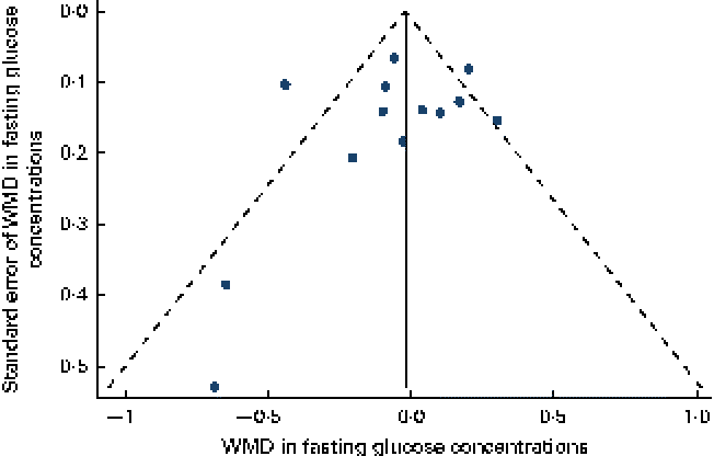 Fig. 3 Funnel plot with pseudo-95 % CI for the effect of oat intake on fasting glucose concentrations. WMD, weighted mean difference. (A colour version of this figure can be found online at http://www.journals.cambridge.org/bjn).