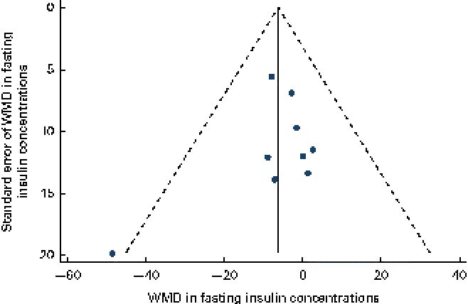 Fig. 5 Funnel plot with pseudo-95 % CI for the effect of oat intake on fasting insulin concentrations. WMD, weighted mean difference. (A colour version of this figure can be found online at http://www.journals.cambridge.org/bjn).