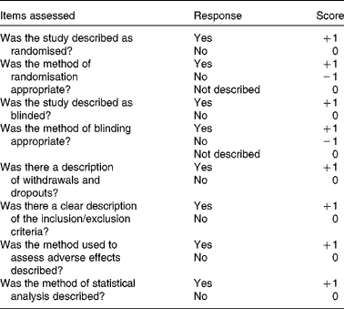 Methodological assessment was conducted using the modified Jadad scale( Reference Oremus, Wolfson and Perrault 22 ). It is an eight-item scale designed to assess randomisation, blinding, withdrawals and dropouts, inclusion and exclusion criteria, adverse effects and statistical analysis results (Table 1). The score for each article could range from 0 (lowest quality) to 8 (highest quality). The scores of 4 to 8 denote good to excellent quality and 0 to 3 poor to low quality. Critical appraisal was done by one investigator (L. B.) and was verified by another (M. X.).