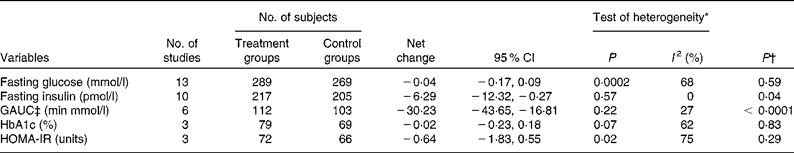 Table 4 Results of the subgroup analyses of the effect of oat intake on fasting glucose and insulin concentrations (Number of studies, net changes and 95 % confidence intervals)