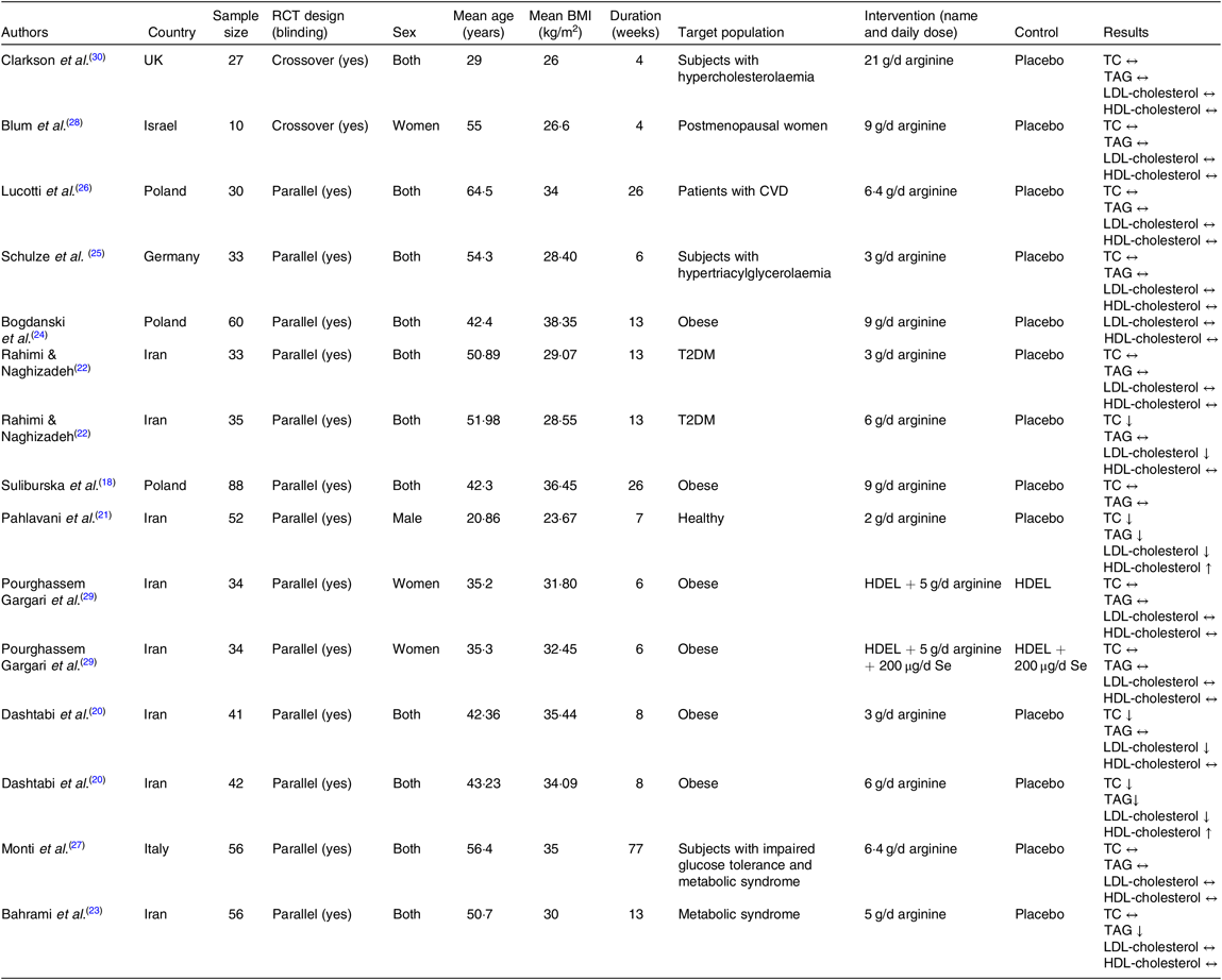Characteristics of the included trials are outlined in Table 2. In total, 631 participants were enrolled in the selected articles, out of which 359 individuals were allocated to l-arginine supplementation group and 272 subjects to the control group. These studies were published between 1996 and 2019 and were carried out in the Iran(Reference Dashtabi, Mazloom and Fararouei20–Reference Bahrami, Mozaffari-Khosravi and Zavar-Reza23, Reference Pourghassem Gargari, Alizadeh and Safaeiyan29), Italy(Reference Monti, Galluccio and Villa27), Poland(Reference Suliburska, Bogdanski and Szulinska18, Reference Bogdanski, Suliburska and Grabanska24, Reference Lucotti, Monti and Setola26), Israel(Reference Blum, Cannon and Costello28), UK(Reference Clarkson, Adams and Powe30) and Germany(Reference Schulze, Glos and Petruschka25). All studies except two(Reference Blum, Cannon and Costello28, Reference Clarkson, Adams and Powe30) adopted a parallel study design. The mean age of the participants ranged from 20·86 to 64·5 years, and the mean baseline BMI varied from 23·67 to 38·35 kg/m2. Only one(Reference Pahlavani, Jafari and Sadeghi21) of included studies involved exclusively male population, two(Reference Blum, Cannon and Costello28, Reference Pourghassem Gargari, Alizadeh and Safaeiyan29) involved women and the other trials involved populations of mixed sex. The follow-up period ranged from 4 to 77 weeks. In these studies, the daily supplementation dosage of l-arginine varied between 1 and 21 g/d. The health status of the included participants was mixed and included type 2 diabetes patients(Reference Rahimi and Naghizadeh22), postmeno-pausal women(Reference Blum, Cannon and Costello28), patients with CVD(Reference Lucotti, Monti and Setola26), subjects with hyper-cholesterolaemia(Reference Clarkson, Adams and Powe30), obese individuals(Reference Suliburska, Bogdanski and Szulinska18, Reference Dashtabi, Mazloom and Fararouei20, Reference Bogdanski, Suliburska and Grabanska24, Reference Pourghassem Gargari, Alizadeh and Safaeiyan29), subjects with hypertriacylglycerolaemia(Reference Schulze, Glos and Petruschka25), individuals with the metabolic syndrome(Reference Bahrami, Mozaffari-Khosravi and Zavar-Reza23), healthy subjects(Reference Pahlavani, Jafari and Sadeghi21) and those with impaired glucose tolerance and the metabolic syndrome(Reference Monti, Galluccio and Villa27). No major adverse effects attributable to intervention or control were reported in RCT.