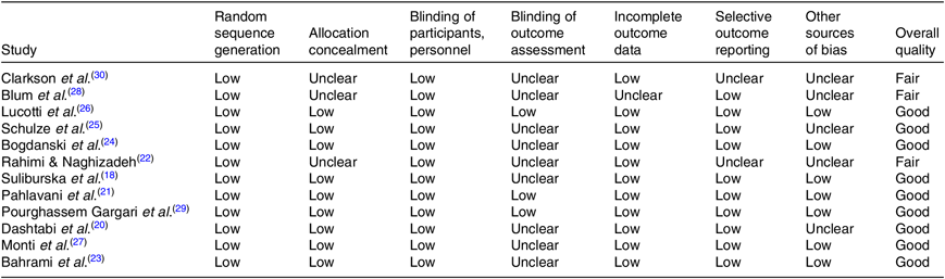 Among twelve studies included in the present review, nine trials(Reference Suliburska, Bogdanski and Szulinska18, Reference Dashtabi, Mazloom and Fararouei20, Reference Pahlavani, Jafari and Sadeghi21–Reference Pourghassem Gargari, Alizadeh and Safaeiyan29) were categorised as good quality and three trials(Reference Rahimi and Naghizadeh22, Reference Blum, Cannon and Costello28, Reference Clarkson, Adams and Powe30) as fair quality. The details of the risk of bias in individual studies according to the domains used by the Cochrane Collaborations tool are provided in Table 3.