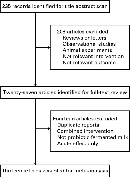 Fig. 1 shows the flow of the literature search. An initial search of the three electronic databases identified 235 records, of which the majority were excluded based on title and abstract scan, leaving twenty-seven articles for full-text review. Of these articles, fourteen were excluded because they used enzymatically hydrolysed milk or other fermented milk products rather than probiotic fermented milk as the intervention product, had a co-intervention of other supplementations, measured acute effect only or were duplicate reports from the same trial (detailed reasons for the exclusion of these fourteen articles are given in Table S1, available online). Finally, thirteen articles (fourteen trials) were selected for the final analysis.