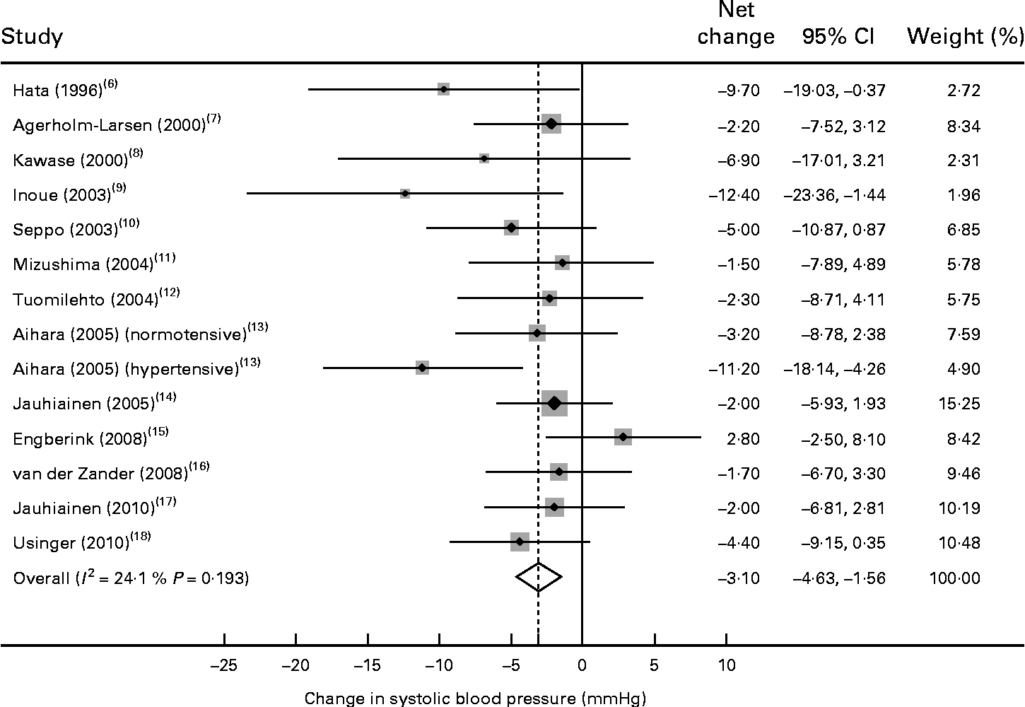 Of the fourteen trials, thirteen reported a reduction in systolic BP after probiotic fermented milk intervention, with mean net changes ranging from − 1·5 to − 12·4 mmHg. Compared with the control, the pooled effect size was − 3·10 mmHg (95 % CI − 4·64, − 1·56) for systolic BP (Fig. 2), with no evidence of heterogeneity between the trials (P= 0·19 and I 2= 24·1 %).