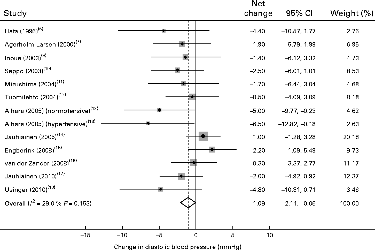 Of the thirteen trials, one trial( Reference Agerholm-Larsen, Raben and Haulrik 7 ) reported data for systolic BP only and eleven trials reported a reduction in diastolic BP after probiotic fermented milk consumption, with mean net changes ranging from − 0·3 to − 6·5 mmHg. The pooled effect size was − 1·09 mmHg (95 % CI − 2·11, − 0·06) for diastolic BP (Fig. 3), without an indication of heterogeneity (P= 0·15 and I 2= 29 %).