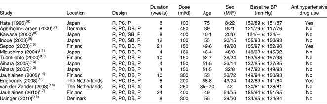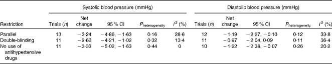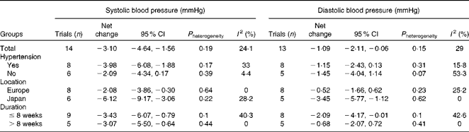 Table 2 presents the results of subgroup analyses according to hypertension status, study location and duration of intervention. Hypertensive participants, compared with normotensive ones, experienced a greater reduction in systolic BP ( − 3·98 v. − 2·09 mmHg). Trials conducted in Japan, compared with those carried out in European countries, showed a markedly greater reduction in both systolic BP ( − 6·12 v. − 2·08 mmHg) and diastolic BP ( − 3·45 v. − 0·52 mmHg).