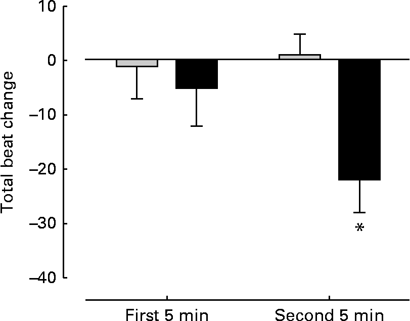 Fig. 3 Change in total heart beats during steady-state cycling. Measurements taken over the first and second 5 min of steady-state cycling. Values are means, with their standard errors represented by vertical bars. * Mean value was significantly different from that of the control group (