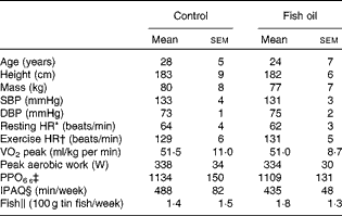 Dietary fish consumption contributes to a reduced risk of primary cardiac arrest( Reference Mozaffarian and Rimm 1 , Reference James, Sullivan and Metcalf 2 ), including primary prevention of sudden cardiac death( Reference Siscovick, Raudgunathan and Weinmann 3 ). Fish and fish oils (FO) are the primary sources of the n-3 long-chain PUFA (LC-PUFA) EPA and DHA. The myocardium of humans and animals preferentially incorporates DHA( Reference Metcalf, James and Gibson 4 , Reference Owen, Peter-Przyborowska and Hoy 5 ), even at a very low dose of FO supplementation( Reference Slee, McLennan and Owen 6 ). Increased myocardial DHA concentrations can modulate myocardial oxygen consumption( Reference Pepe and McLennan 7 ) and prevent ventricular fibrillation induced by ischaemia, reperfusion or programmed electrical stimulation( Reference Pepe and McLennan 7 – Reference Pepe and McLennan 9 ). The attributable advantage of n-3 LC-PUFA incorporation is a reduction in the resting heart rate (HR)( Reference Mozaffarian, Geelen and Brouwer 10 , Reference McLennan and Abeywardena 11 ). There is additional evidence that n-3 LC-PUFA improve cardiac function and reduce HR when myocardial oxygen demand is increased( Reference McLennan 12 ). FO supplementation has been found to reduce submaximal HR, underpinned by increased parasympathetic tone, in exercise-intolerant adults( Reference Ninio, Hill and Howe 13 ). A recent review supports the notion that increased dietary fish consumption can alter autonomic tone in favour of increased parasympathetic activity( Reference Xin, Wei and Li 14 ); however, studies are heavily weighted towards populations with compromised heart function. This is also true for HR recovery, whereby limited data have indicated that FO improved HR recovery at 1 min after the cessation of exercise in post-myocardial infarct males( Reference O'Keefe, Abuissa and Sastre 15 ), in whom the aetiology of the disease state is variable.