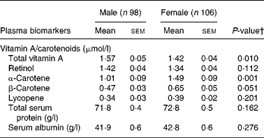 Table 2 Plasma concentrations of vitamin A, carotenoids and other biomarkers in raw food diet adherents (n 198)* (Mean values with their standard errors)