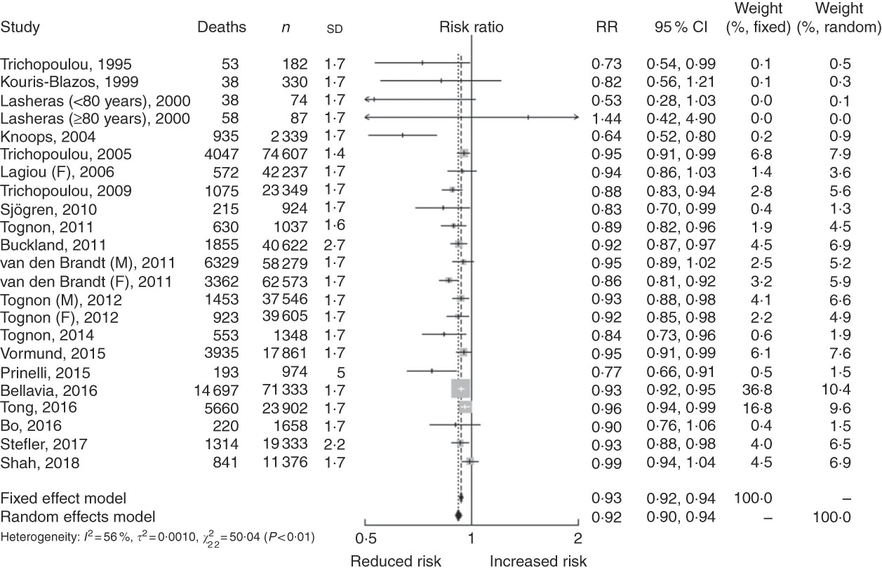 Heterogeneity among RR associated with MDS was not negligible; however, the consistency of our findings with those reported in other meta-analyses of the MedDiet in relation to various health outcomes( Reference Dinu, Pagliai and Casini 6 ) reassures the accuracy of our results. With respect to confounding, the well-accepted risk factors for mortality were controlled for in many studies, especially the most recent ones, and we used multivariate RR adjusted for all available covariates in our meta-analyses. Finally, the estimated RR referring to the individual components of the MedDiet were based on country-specific medians, which differ across countries, although the use of random-effects models may overcome this problem up to a certain point.