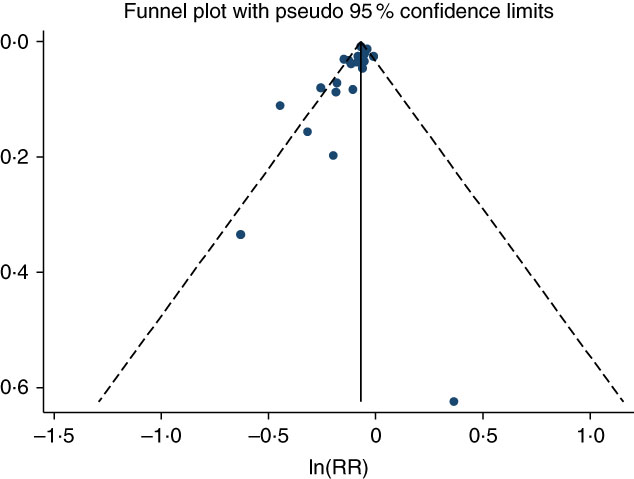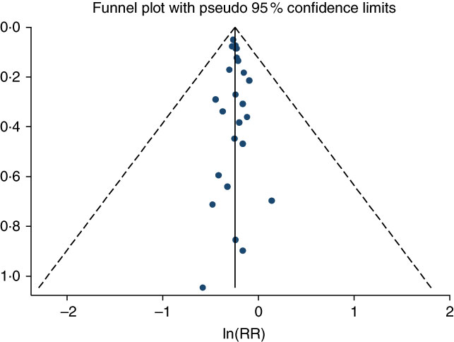 Fig. 4 Funnel plot for the assessment of publication bias in the studies included in the meta-analysis of mortality in association with the highest v. the lowest level of Mediterranean diet score (P for Egger test 0·67; P for Begg’s test 0·83). Dashed diagonal lines indicate 95 % CI.
