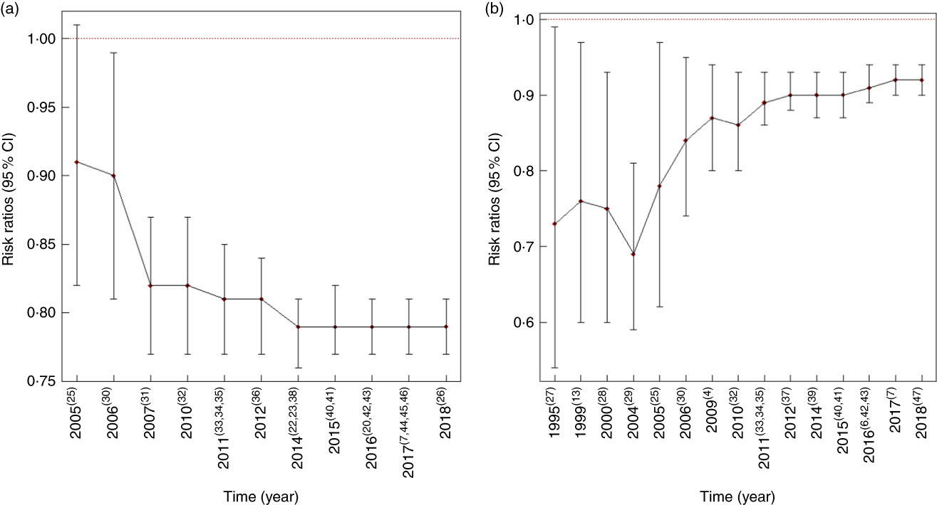RR of highest v. lowest MDS among studies undertaken in USA and Europe were 0·78 (95 % CI 0·76, 0·80) and 0·82 (95 % CI 0·78, 0·88), respectively, with higher heterogeneity observed among the US (I 2=55 %, P-heterogeneity 0·02) rather than European studies (I 2=10 %, P-heterogeneity 0·33). In analysis confined to European studies, stratification by geographical location revealed stronger summary RR among Mediterranean populations, and weakest ones among the fewer studies conducted in central/eastern Europe for both the highest/lowest or the per sd increment in MDS. Similar summary RR were estimated among studies with different spread of distribution of MDS – that is, those that used MDS scales of 0–9 or greater. Stratification by publication year revealed high consistency in RR after 2011, when the majority of the studies were published (Fig. 6(a) and (b)).