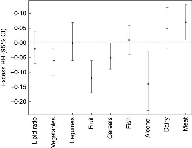 Fig. 7 Summary excess relative risk (RR) and 95 % CI of mortality associated with each of the components of the Mediterranean diet being above v. below the study-specific median intake (lipid ratio, vegetables, fruit, legumes, cereals, dairy products, meat and products, fish) or for moderate v. none/excess consumption (alcohol). The combined hazard ratio and 95 % CI were calculated using the random-effects models.