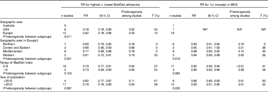 We also conducted meta-analyses in strata of geographical area (USA, Australia, Europe (Northern, Central/Eastern, Western, Mediterranean)), range of MDS scale (0–9, >9), in order to account for the different spread of the distribution of the MedDiet indices used in each study, and year of publication (<2010, 2010–2014, >2014). RR estimated from the multi-centre EPIC study( Reference Trichopoulou, Orfanos and Norat 28 ) were considered both overall and cohort-specific in meta-analyses stratified by country.
