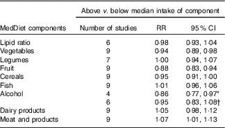 Table 3 Summary relative risks (RR) and 95 % CI of all-cause mortality for the above v. below the study-specific median intake in each of the components of the Mediterranean diet (MedDiet)