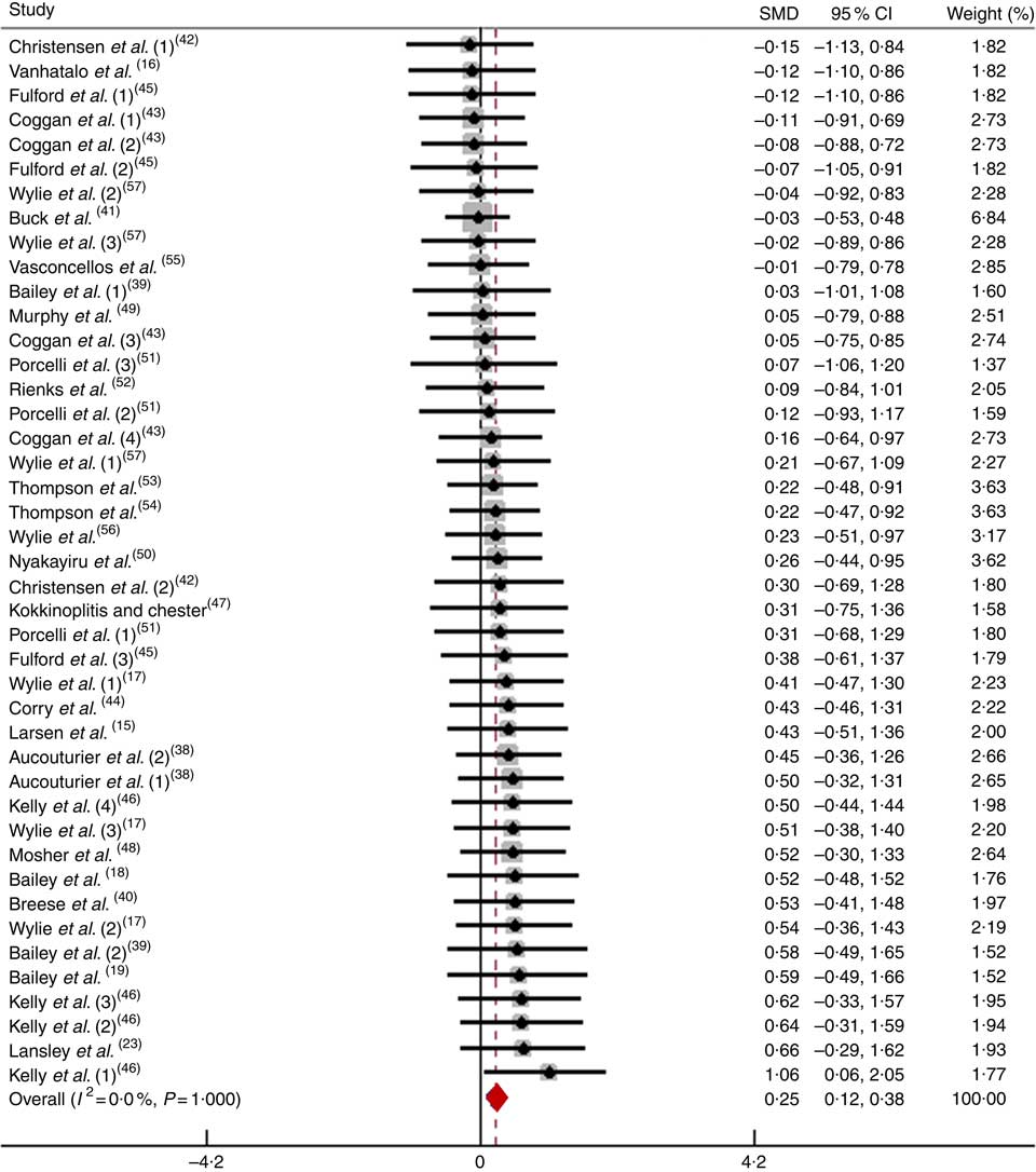 After pooling the data from forty-three trials, the mean effect size was 0·25 (95 % CI 0·11, 0·38), which indicates that the dietary NO3 − supplementation had a small and significant beneficial effect on physical performance (P<0·05; Fig. 3). According to a fixed-effects analysis, no heterogeneity was observed among these studies (I 2=0 %; Q=15·26, df=42, P=1·00).