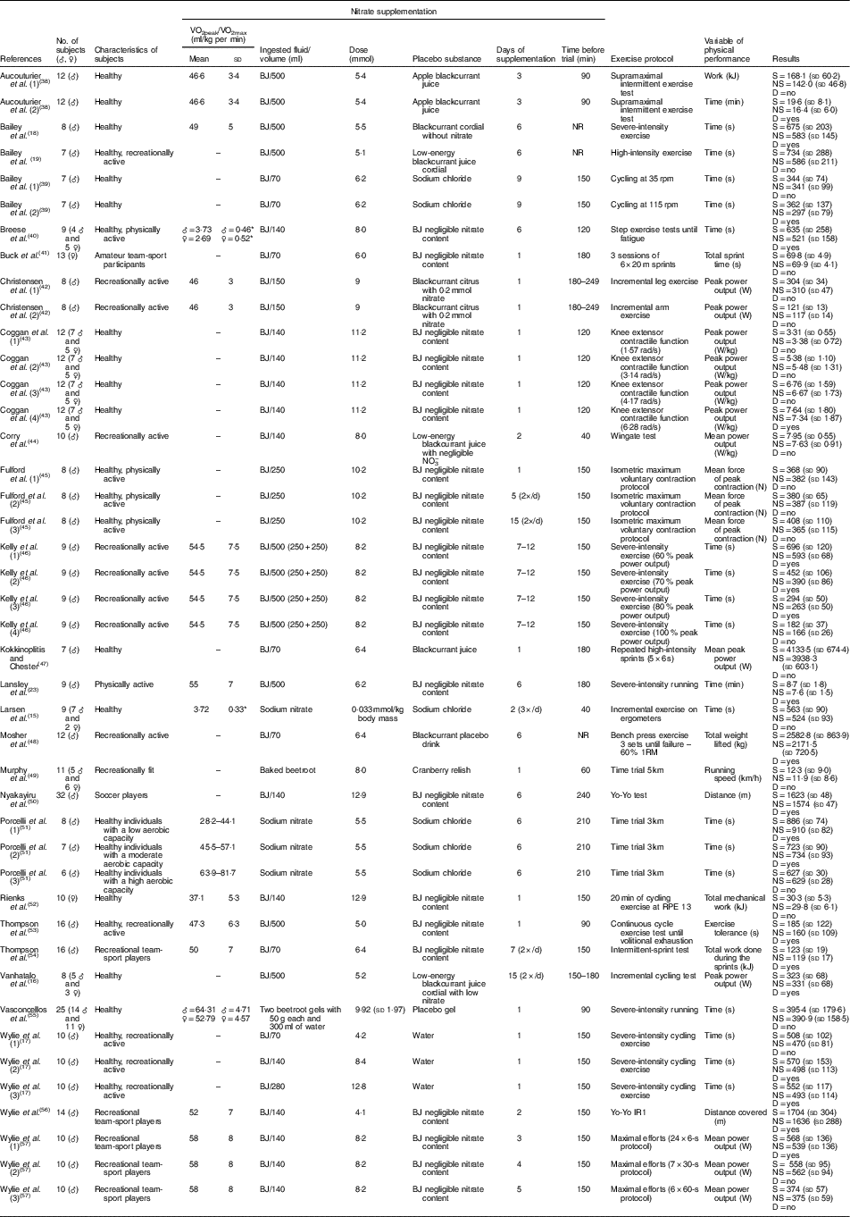 The characteristics of the subjects, including information regarding the supplementation regimens and effects of NO3 − supplementation on the physical performance of non-athletes and athletes in each study, are summarised in Tables 1 and 2, respectively. Notably, most studies used beetroot juice as a form of NO3 − supplementation. However, these studies were heterogeneous in several supplementation features, including the ingested volume (70, 140, 250, 280 or 500 ml), dose (between 4·0 and 19·5 mmol), days of supplementation (between 1 and 15 d), timing of supplementation before the trial (between 40 and 1440 min) and the parameter measured to determine physical performance.