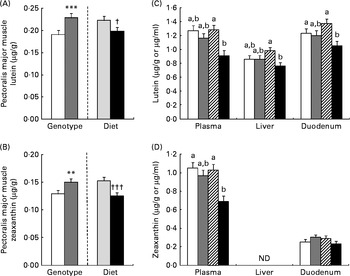, GG control; ■, GG β-carotene). Values are least-squares means (n 16 chickens per treatment), with their pooled standard errors represented by vertical bars. a,bLeast-squares mean values with unlike letters were significantly different within a tissue or plasma (P <0·05). Least-squares mean value was significantly different from that of the AA genotype: ** P <0·01, *** P <0·001. Least-squares mean value was significantly different from that of the control diet: † P <0·05, ††† P <0·001. For lutein concentrations, there was a significant effect for diet (P= 0·002 (plasma), P= 0·03 (liver) and P= 0·02 (duodenum)) and the genotype × diet interaction was significant (P= 0·004 (plasma), P= 0·02 (liver) and P= 0·04 (duodenum)). For plasma zeaxanthin concentrations, there were significant genotype (P= 0·02) and diet (P= 0·001) effects, and the genotype × diet interaction was significant (P= 0·03). ND, not determined.