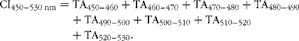 All carcasses were processed 1 d after slaughter. Abdominal fat, breast muscles (pectoralis minor and pectoralis major) and liver were removed and weighed, and their respective yields were calculated and expressed as the percentage of live body weight at slaughter. Lipid contents of the liver and pectoralis major muscle were determined according to the method described by Folch et al. ( Reference Folch, Lees and Sloane Stanley 31 ). The colour of the pectoralis major muscle (internal part), duodenum (external face) and abdominal fat was measured by a Miniscan spectrocolorimeter (Hunterlab) according to the CIELAB trichromic system for lightness (L*), redness (a*) and yellowness (b*) values 15 min post-mortem for the duodenum and 24 h post-mortem for the other tissues. The absorbance spectrum of the plasma was measured between the wavelength of 400 and 700 nm by a spectrophotometer (Infinite M200; Tecan). Each absorbance spectrum was translated to make the value at 530 nm equal to zero( Reference Nozière, Grolier and Durand 32 , Reference Calderón, Chauveau-Duriot and Pradel 33 ). The colour index (CI), which corresponds to the absolute value of the integral of the translated spectrum between the wavelength of 450 and 530 nm, was measured by calculating the trapezoid area (TA) between the 450 and 530 nm wavelengths as follows: