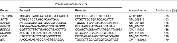 18S rRNA, 18S ribosomal RNA; ACTB, β-actin; GAPDH, glyceraldehyde-3-phosphate dehydrogenase; BCMO1, β,β-carotene 15,15′-mono-oxygenase 1; BCDO2, β,β-carotene 9′,10′-dioxygenase 2; SCARB1, scavenger receptor class B type 1; CD36, cluster determinant 36. ISX, intestine-specific homeobox.
