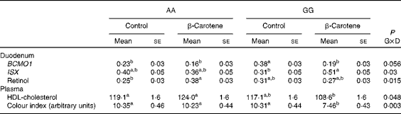 Table 4 Intestine-specific homeobox (ISX) mRNA levels and retinol concentration in the duodenum and HDL-cholesterol concentration and colour index in the plasma of AA or GG chickens fed the control or the β-carotene-supplemented diet (Least-squares mean values with their standard errors; n 16)