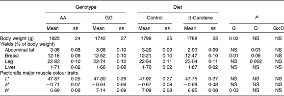 Table 7 Body weight and yields and colour traits of 63-d-old chickens in relation to genotype (G) and dietary β-carotene (D) (Least-squares mean values with their standard errors; n 92–120 per genotype and n 105–106 per diet except for plasma colour index)