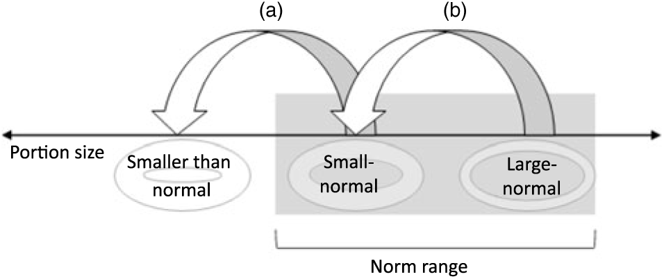 Fig. 1. Norm range model. Norm range = range of portions visually perceived as ‘normal’ by an independent sample of participants. (a) and (b) represent equivalent changes to portion size. Significantly greater additional intake hypothesised for (a) comparison of ‘smaller than normal’ to ‘small-normal’, but not (b) comparison of ‘small-normal’ to ‘large-normal’. Significant reduction in overall energy intake hypothesised for (b) comparison of ‘small-normal’ to ‘large-normal’ but not (a) comparison of ‘smaller than normal’ to ‘small normal’.