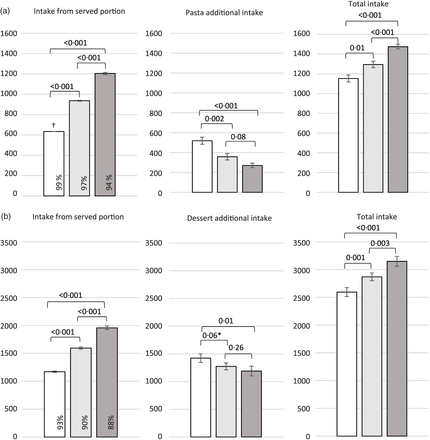 Fig. 2. Energy intake (kJ) by portion size condition for Study 1 (a) and Study 2 (b). Percentage values represent intake as a percentage of served portion. Error bars represent standard errors. Values on comparison bars are P for pairwise comparisons. *P < 0·05 in pre-registered sensitivity analyses. (