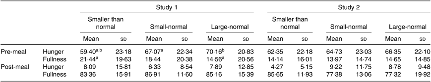 In Study 1 there was a significant interaction between time (pre-post) and portion size condition on hunger and fullness, explained by pre-meal appetite being lower in the ‘smaller than normal’ condition (Table 1). Separate linear mixed models testing the main hypotheses in Study 1 while controlling for pre-meal appetite revealed results consistent with the primary analyses, except that in line with our theoretical predictions, there was no significant difference in total meal intake between ‘smaller than normal’ and ‘small normal’ portion size conditions, and a marginally significant difference in total meal energy intake between ‘large normal’ and ‘small normal’ portions. There was no significant main effect of condition or interaction between condition and time predicting appetite ratings in Study 2 (see online Supplementary materials for full results and Table 1 for mean hunger and fullness ratings).
