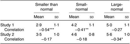 Consistent with the norm range model, ratings on the perceived normality scale were negatively correlated with additional intake in each respective portion size condition with ‘higher than normal’ ratings predicting lower intake and ‘lower than normal’ ratings predicting lower intake, although this was not statistically significant across all conditions (Table 2). Similarly, the aggregated correlation between ratings of perceived normality and additional intake in each respective condition indicated that higher perceived normality ratings were associated with lower additional intake overall, but this correlation was significant in Study 1 (r −0·35, P < 0·001), but not in Study 2 (r −0·22, P = 0·056).