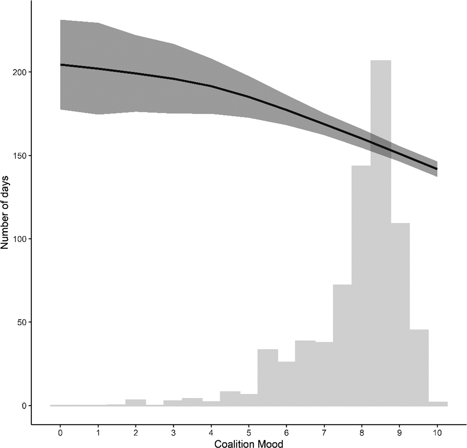 Notes: The shaded area around the solid line depicts the 95 per cent confidence interval. The histogram shows the relative distribution of the coalition mood.