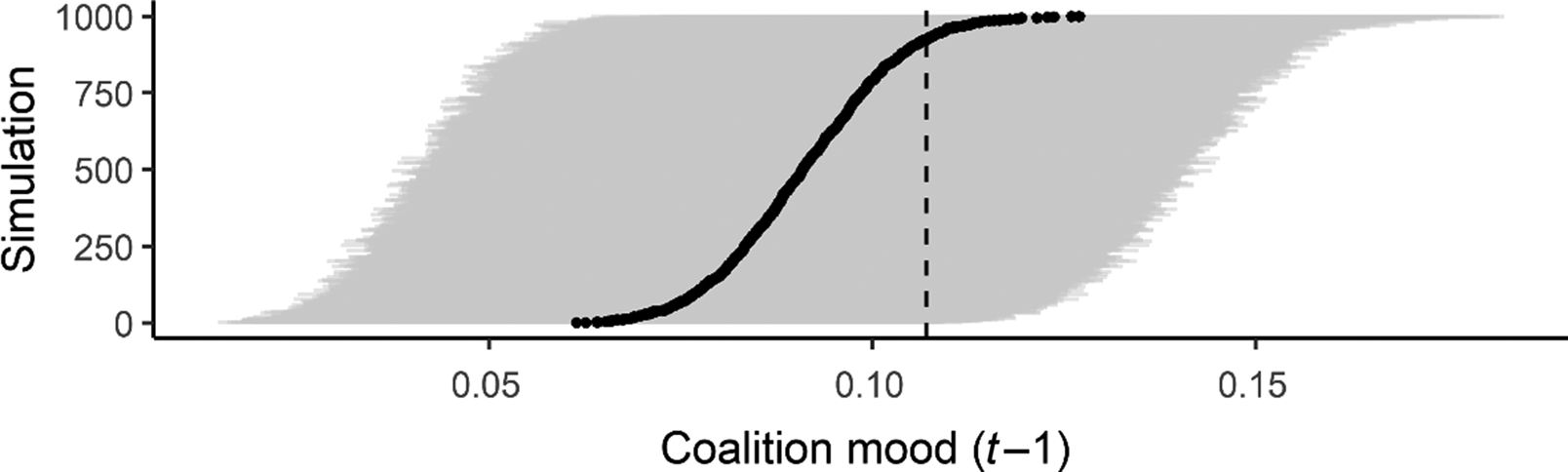Fig. 6. Simulations to assess the estimation uncertainty of the coalition mood effect.