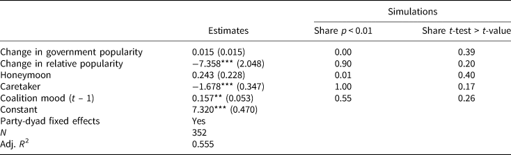 An important caveat for assessing its concurrent validity is the uncertainty that surrounds the monthly estimates of the coalition mood. This raises the question of whether the negative relationship between the change in relative popularity and the coalition mood is sufficiently robust to account for measurement error in the dependent variable. We address this issue by simulating the data-generating process and model fitting based on the model estimates and bootstrapped standard errors obtained from the negative binomial model. Specifically, we generate 1,000 samples of the monthly coalition mood by randomly sampling from a normal distribution with mean and standard deviation given by the model estimate and bootstrapped standard error, respectively, and re-estimate the model in Table 1 predicting coalition mood 1,000 times. This process provides us with 1,000 simulated regression coefficients, along with standard errors.