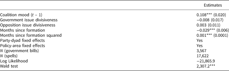 The third type of validity we want to demonstrate is predictive validity. The goal for this section is to show that the coalition mood can be used to predict the time legislative bills proposed by the government take to pass. Government bills are the centre of legislative activity in almost all European parliamentary democracies (Andeweg and Nijzink Reference Andeweg and Nijzink1995). While such bills formally need approval by the whole government, they are drafted not by the cabinet as a collective body, but usually by individual ministers and their departments (Laver and Shepsle Reference Laver and Shepsle1994). As these ministers usually have high autonomy in drafting the bills, ministers have to be monitored – especially in coalition governments. This task often involves the legislative arena (Bäck et al. Reference Bäck2022; Martin and Vanberg Reference Martin and Vanberg2004; Martin and Vanberg Reference Martin and Vanberg2011). As Martin and Vanberg show, ideological differences within the government indeed cause delays in the legislative process, as MPs have to ‘keep tabs’ on their coalition partner more thoroughly. We argue that the coalition mood might play a role here as well: if things are going well between coalition partners, MPs might be more trusting that ministers of the other party adhere to the coalition agreement, while they might be especially cautious if the mood is bad.
