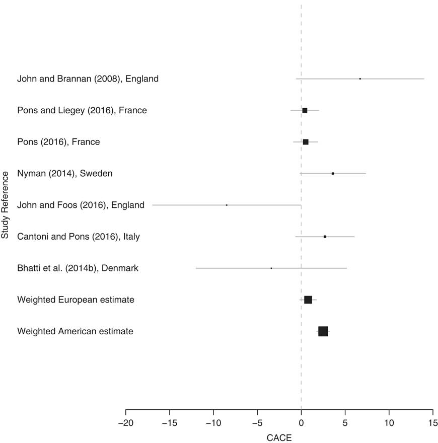 Finally,Footnote 25 Cantoni and PonsFootnote 26 had volunteers and candidates canvass voters in one municipality in Italy’s European and municipality elections of 2014. They found that volunteers increased turnout, while candidates failed to produce an effect. The volunteer canvassers had an ITT of 1.8 percentage points, while the effect for the candidates was −0.2 percentage points. The contact rates were 35.9 and 45.5 per cent, respectively. When we convert the ITTs to the CACEsFootnote 27 and weigh them by their precision, we get a pooled CACE of 2.7 percentage points with a standard error of 1.7.