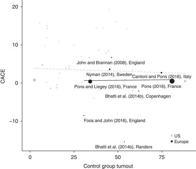 One source of heterogeneity could be salience or turnout levels. This could also help explain the smaller effects in Europe. Turnout in many of the elections in question is at least comparable to a high-turnout American election. Above we suggested that one of the reasons we might not expect effects similar to those in the United States is that the results could be subject to a ceiling effect. To examine this possibility, we plot the CACEs against the control groups’ turnout rates in Figure 2. The size of each point is proportional to the estimate’s precision. Furthermore, the fitted line is from a regression of CACE on control group turnout weighted by precision. Figure 2 reveals a practically flat relationship between turnout in the control group and the effect size. However, control group turnout rates are not randomly assigned. Thus we cannot be certain whether effects in contexts with low turnout rates would change if these places suddenly increased overall turnout.Footnote 37