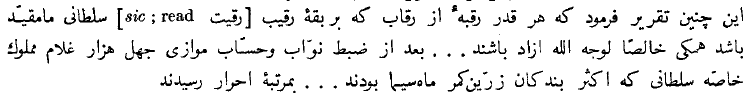 'aẓbqa-i nāfi ‘a mebde’ olub ‘jemī'-i 'abid ye memālikim aḥrār cdsunlar’ demekte hisāb olindukda kirk bin raqabe ribqa-i riqqdan āzād oldi.