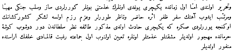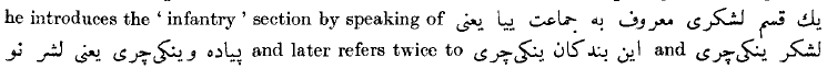43 Uruj, MS Oxford (ed. Babinger, 22): aṣilda yeničerinün bunyādi budur, ol vaqitclenberü adint yenčeri kodilar; MS Cambridge (ed. Babinger, 94) lacks aṣilda and ol vagitelenberli; MS Manisa (fol. 21r) begins yeničerinün aṣli bunyādi… and continues as Oxford; MS Paris, Bibl. Nat. supp. t. 1047 (fol. 17V): aṣilda yeničerinün bunyādi budur, ol vagitdenberü adi yeničeridür. The W1, recension of the Anonymous Chronicles has the clauses transposed (ed. Giese, 22): ve hem adini yeničeri kodilar, bunlarun aṣla ol vaqitdenberü, oldi; the W3 recension has a single, telescoped, clause (MSS M2L): yeničerinün adini ol vaqitdenberü, yeničeri kodilar (cf. Annales: et inde ab illis usque temporibus nomen hoc Genizarorum adepti retinent). 'Apz. reads (£ 46) adin yeničeri kodilar, yeničeri bunun zamāninda vāqi' with the same transposition as W1.