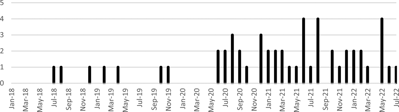 Wade, who has been working full-time for the US Chamber since 2018, stresses the importance of “timing” and the murder of George Floyd for advancing the EOI agenda: “Even if you had been engaged before the tragedy of George Floyd,” he recalls, business engagement “increased exponentially” following Floyd's murder: “In a time that was about the murder of George Floyd and the pandemic that was disproportionately affecting black and brown people the consciousness of these issues was at an all-time high.” Wade “decided that the Chamber had to be a leader in this moment in time. This was a historic moment that was a critical turning point in our recent history.” Wade was convinced that the chamber “had to step up at this leadership moment.”Footnote 31 As we can see in Figure 1, the frequency of chamber EOI-related press releases increased significantly following Floyd's murder on May 25, 2020: