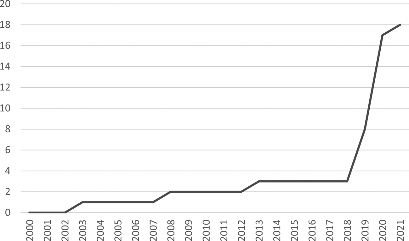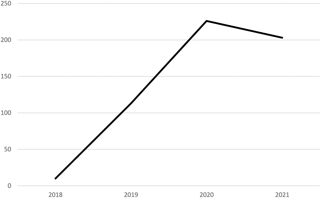 Nunnelly-Sparks asked: “Why are we boycotting something that is trying to right a wrong? Instead of boycotting the chamber let's bring ourselves, our dollars, our cents to the chamber.” Her specific idea was to help overcome barriers to access for Black-owned businesses that would like to get involved with JACC. She did this by “raising money to pay for [chamber] memberships” for these Black-owned businesses through the Langston Hughes society, an African American nonprofit based in Joplin. “If you're a small minority run business $500 is a lot…. That's how it began.”Footnote 100 The Langston Hughes society ended up paying for a substantial number of memberships, which contributed to a notable increase in the number of minority-owned businesses in the JACC between 2018 and 2021 (Figure 6).