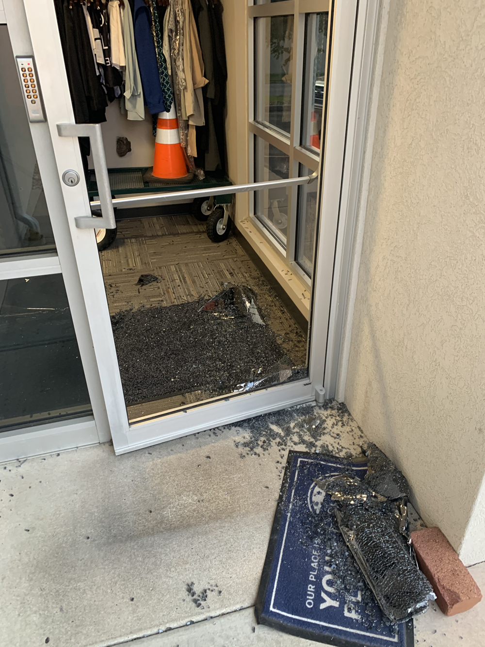 It did not take long for the backlash to arrive on Facebook; there were calls to boycott the chamber, and for Teeter to resign. He was threatened 15–20 times, and there were counterprotests that culminated in an antichamber movement. The JACC's board of directors was split and provided only tepid support. “They were not overwhelmingly joyously in the boat,” Teeter recalls. Before Teeter was scheduled to give a speech in front of the city council, a rock was thrown through the glass door of the JACC (Figure 3).