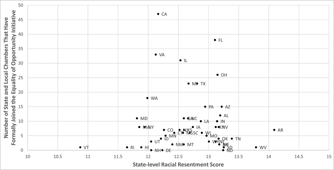 Figure 7. The relationship between the state-level racial resentment scores and the number of chambers in each state that have joined the EOI as partners.